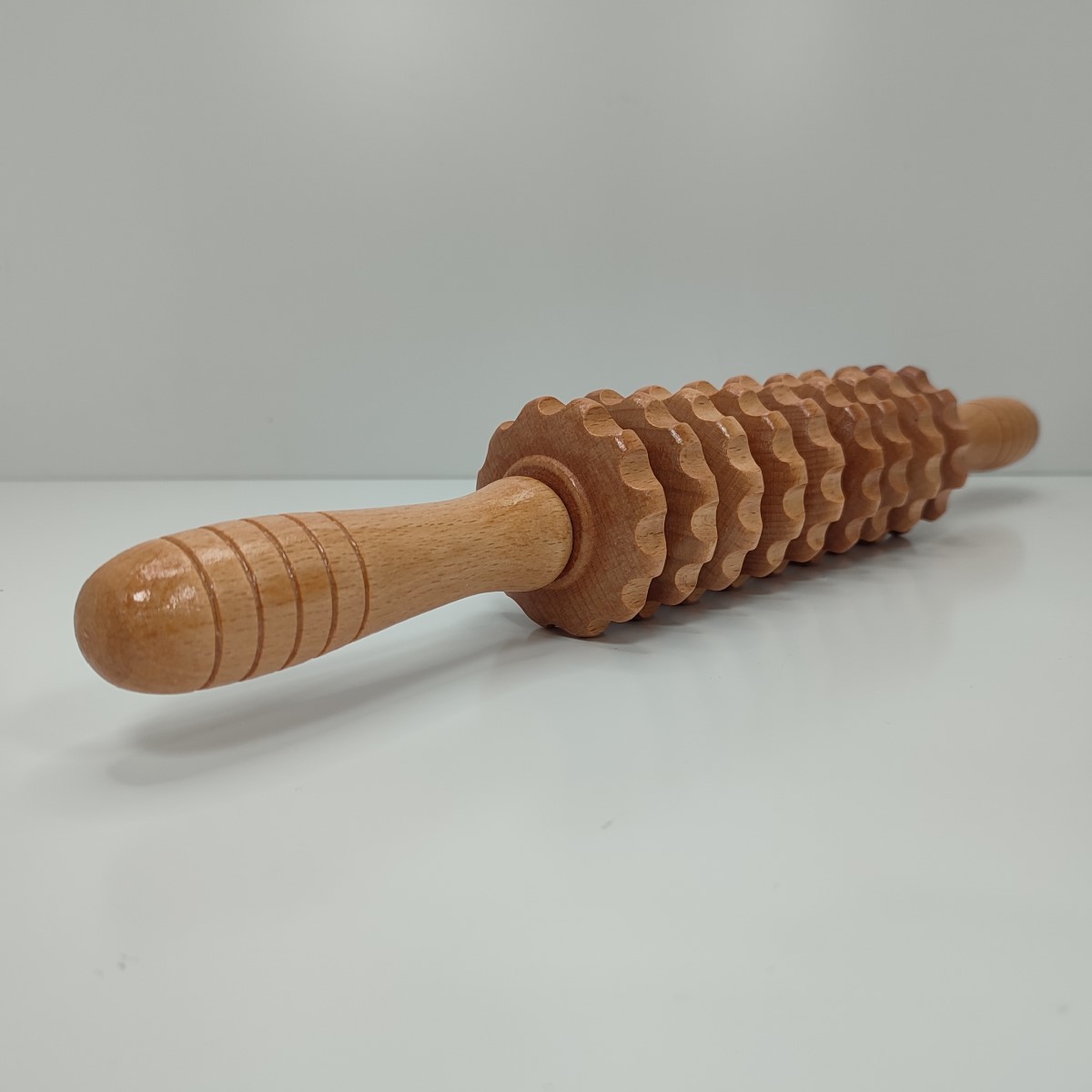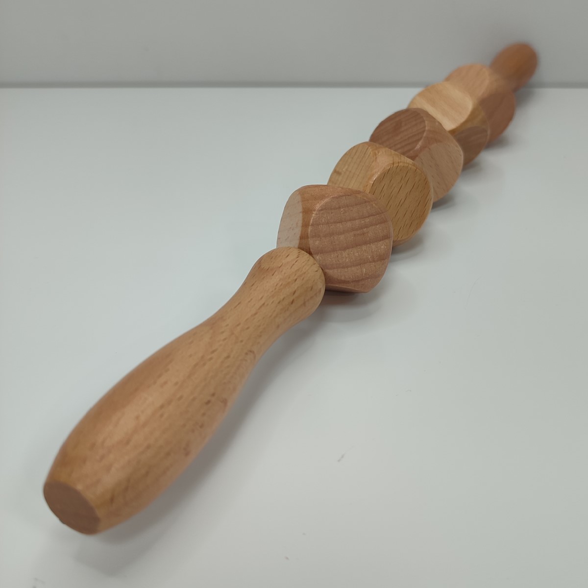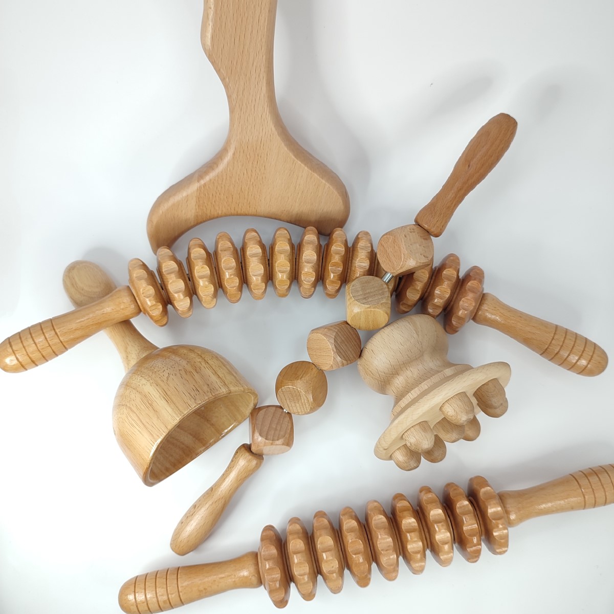 Kit de trabajo completo de madera de alta calidad, compuesto por 6 herramientos (rodillo estriado, rodillo curvo, rodrillo de cubos, champiñón, copa y pala) de acabado suave y liso. Imprescindibles para tratamientos de Maderoterapia.